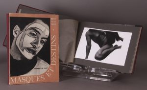 Tirages argentiques jusqu'au format 38 x 30. Cachet «Photo Daniel Frasnay» aux dos. Ensemble en très bonne condition. Comprend deux nus, et des portraits d'artistes, d'écrivains (Paul Delvaux, Léo Ferré, James Hadley Chase),. Joint : Thérèse LE PRAT (photographe française). Masques et destins. Masks Fates Faces. Paris, Olivier Perrin Editeur, 1955. Portefeuille contenant 52 portraits en héliogravure d'acteurs et actrices principalement français. En bonne condition.