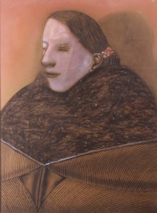 Technique mixte sur papier Canson posé sur panneau, 78 x 58. Signée «Caterina» en haut à droite. Sous verre et passe-partout blanc, dans un cadre de bois naturel.