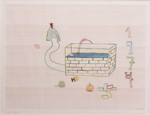 Marqueurs sur papier millimétré, 51 x 68. Signés au marqueur en bas à droite. Très frais. Sous verre, dans des cadres blancs. Sujets : Château; «1974».