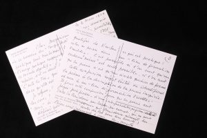 Cartes postales représentant «L'Acte de Foi» et «Le Chef-d'Œuvre» (Berger Editeur, Bruxelles). Texte : «Cher monsieur, je vous remercie de ce numéro des «Temps Modernes». Il en cite des passages et les discute en se référant à la première reproduction. Il parle de «l'interprétation psychanaliste» [sic] «de Baudelaire par Sartre, par exemple, qui ne peut soupçonner que Baudelaire aimait les contes de Poe pour leur beauté». Document en parfaite condition.