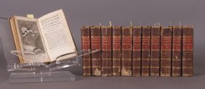 A Paris, de l'Imprimerie Royale, 1769-1770. 12 vol. petit in-8 (17,5 x 10), en cartonnage d'époque, pièces de titre maroquin orange. Notre exemplaire comprend la Théorie de la Terre (2 vol), Histoire naturelle des animaux (1 vol.), Histoire naturelle de l'homme (1 vol.), Histoire des mammifères (8 vol.), sans les oiseaux, les poissons et autres. Illustré de 182 planches (en grande majorité à deux sujets), de deux cartes et d'un tableau dépliant. Petits défauts aux reliures (usures, petits manques à des coiffes,...) Intérieur frais, sauf quelques travaux de vers marginaux et de rares planches lég. abîmées. Cachet de collectionneur anciens aux gardes. Il s'agit de la réédition partielle de la première édition parue à partir de 1749.