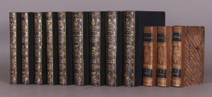 Bruxelles, Adolphe Deros et C Libraires-Editeurs, 1852. 9 vol.in-4 (27 x 18), demi-chagrin noir de l'époque, plats de papier chagriné noir, dos lisses décorés de grands fers dorés ornés notamment de figures d'animaux. Illustré de planches (majoritairement à deux sujets) sous serpentes. Sauf le premier mors du tome VIII en partie détaché, bel exemplaire. Joint : LACEPEDE. Œuvres du comte de Lacépède, comprenant L'histoire naturelle des quadrupèdes ovipares, des serpens, des poissons et des cétacés, accompagnées de 150 planches gravées sur acier, représentant au moins 500 animaux. Paris, P. Duménil, Editeur, 1836. 3 vol. in-8 (21 x 13), demi-veau blond d'époque, dos lisse orné, pièces de titre et de tomaison maroquin noir (reliure de Deltenre, à Lessines). Illustré. Manquent les gardes volantes en papier à la cuve, sinon bon exemplaire.
