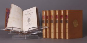 Paris, Imprimerie Royale, 1834-1838. 7 vol. in-8 (21 ,5 x 13,5), plein veau blond pastiche, dos à 5 nerfs ornés de roulette dorée, pièces de titre et de tomaison rouge et olive, plats frappés des armes de la famille Pavée de Vendeuvre, tranches jaspées (une importante bibliothèque historique et littéraire provenant de la famille fut dispersée en vente publique, en 2007 notamment). Il s'agit d'un ouvrage majeur pour l'histoire de l'Utopie; c'est par les œuvres de Diodore de Sicile transmit, et celles Athéniens, l'essentiel des utopies grecques et hellénistiques. Petit ex- libris moderne à la garde. Sauf minimes défauts à la reliure, bel exemplaire dans une élégante reliure.