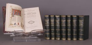 Paris, chez Adrien Le Clere et C Libraires, 1864. In-4 (24,8 x 16), demi-maroquin et coins rouge de l'époque, dos à 5 nerfs, titre et fleurs de lis dorés aux compartiments, tête dorée, xxxii-576 p. Frontispice en couleurs. Ex-libris gravé à la garde. Minimes défauts à la reliure, sinon bel exemplaire. Joint : MICHAUD. Histoire des Croisades. Paris, 1819, 1818, 1817, 1822 (les 4 dernières parties). 7 parties en 7 vol. in-8 (20,5 x 13), demi-veau vert foncé, dos lisse, faux-nerfs et titre doré. Illustré de 7 cartes à déplier. Défaut à une partie des mors. Intérieur frais. Célèbre histoire des Croisades parue pour la première fois en 1812-1822.