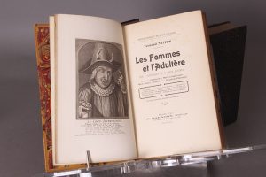 Orné de 48 [sic pour 58] gravures. Ens. 6 vol. Paris, chez l'Editeur, Place de l'Odéon, n° 3, et chez Rousselon, Libraire, 1824-1828. 5 vol. in-8 (20,8 x 13), demi-chagrin marron de l'époque, dos à 5 nerfs, titre doré. Illustré de 58 gravures hors-texte illustrant divers supplices. Petit ex-libris moderne. Sauf de minimes défauts à la reliure, bon exemplaire. L'auteur, ex-chef de la police de sûreté à Paris, se nommait Edme Théodore Bourg, dit Saint- Edme. Joint : MITTON (Fernand). Les Femmes et l'adultère de l'Antiquité à nos jours. Peines - Châtiments - Maris complaisants - Maris jaloux - Anecdotes Situations plaisantes. [.] Ouvrage orné de deux planches hors texte. Paris, H. Daragon, Editeur, 1910. In-8, demi-chagrin jaune de l'époque, dos à 4 nerfs décorés de chaînette dorée, pièce de titre maroquin rouge, fleurons et chiffre du prince Narischkine aux compartiments, tête dorée, les plats de la couverture conservés, 215 p. Exemplaire numéroté sur Alfa vergé de l'édition originale (n° 18 (seul papier après 10 Japon impérial). Ex-libris armorié gravé du prince C. Narischkine à la garde, et ex-libris moderne. Enrichi du Règlement sur la prostitution de la commune de Saint-Josse-ten-Noode, 4 p. imprimées, du 6 juillet 1870. Bel exemplaire.