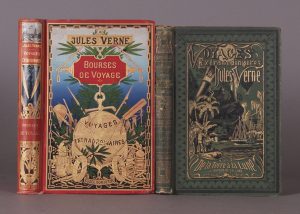 Paris, J. Hetzel et C s. d. Cartonnage à la mappemonde, dos au phare, second plat q (Engel, rel.), tranches dorées. Illustré. Coiffes lég. déformées (la tranchefile apparaît à l'inférieure), sinon bel exemplaire. Joint : VERNE (Jules). De la terre à la lune. Trajet direct en 97 heures 20 minutes. Paris, J. Hetzel et C s. d. Cartonnage vert à l'obus, tranches dorées. Dos du cartonnage abîmé.