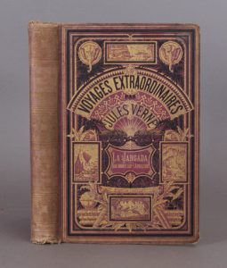 Paris, J. Hetzel et C s. d. Cartonnage violet à deux éléphants. A la fin, catalogue des nouveautés pour 1881-1882. Exemplaire défraîchi : usure générale du cartonnage, coins et coiffes ém., quelques feuillets abîmés (manque le coin inf. des f. 343-344 et 345-346).