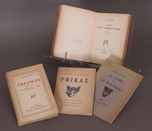 Paris, Editions de la Nouvelle Revue Française, 1921. Petit in-8 (18 x 13), broché, 85 p. Frontispice lithographié. Un des 500 exemplaires numérotés sur papier vergé à la forme des Manufactures d'Arches de l'édition originale. Couverture lég. passée, sinon bel exemplaire. Joint : [DARAGNES]. SALMON (André). L'Amant des amazones. Images gravées par Daragnès. Paris, Editions de la Banderole, 1921 . In-8, demi-vélin, titre doré, premier plat de la couverture conservé. Illustrations de Daragnès en couleurs. Exemplaire numéroté sur pur fil Lafuma. Bel exemplaire. Joint : [DERAIN]. SALMON (André). Archives du club des onze. Paris, Mornay, 1923. In-8, demi-veau et coins rouge, dos à 4 nerfs, titre doré, tête dorée, les plats et le dos de la couverture conservés. Portrait lithographié par André Derain en frontispice. Exemplaire sur vélin de Rives à la forme de l'édition originale. Ex-libris. Dos lég. insolé, sinon bel exemplaire. Joint : SALMON (André). Montparnasse. Paris, André Bonne, 1950. In-8, broché.