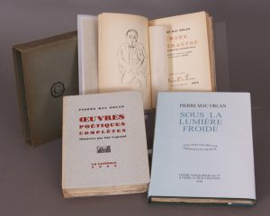 Paris, Editions de la NRF, 1924. Petit in-8 (18,5 x 13,5), en reliure de toile blanche postérieure avec réimpression polychrome de la page de titre (travail soigné), les plats et le dos de la couverture conservés, non rogné. Gravure en frontispice. Exemplaire numéroté sur vergé des papeteries de Navarre de l'édition originale (n° 69). Bon exemplaire. Joint : MAC ORLAN (Pierre). Sous la lumière froide. Avec huit aquarelles originales de l'auteur. Paris, Henri Jonquières et C 1926. in-8 (23,5 x 17), en reliure toile verte, jaquette moderne reproduisant la page de titre, non rogné, 78 p. Illustré de 8 planches hors texte. Un des 275 exemplaires numérotés sur vélin à la forme de Rives de l'édition originale. Bon exemplaire. Joint : MAC ORLAN (Pierre). Œuvres poétiques complètes. Illustrées par Edy Legrand. Paris, Le Capitole, 1926. In-8 (19,5 x 14,5), broché, couverture rempliée. Illustré de planches hors texte d'Edy Legrand. Bel exemplaire.