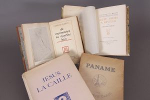 Paris, Albin Michel, Editeur, 1927. In-8 (19 x 12,5), demi-chagrin et coins havane, dos lisse à décor de filets dorés, les plats et le dos de la couverture conservés, tête dorée, les autres tranches non rognées. Un des 160 exemplaires numérotés sur Hollande Van Gelder de l'édition originale (n° 41 ; premier papier avant 320 vergé). Ex-libris moderne. Quelques illustrations ajoutes aux gardes volantes. Dos insolé. Intérieur frais. Joint : [DIGNIMONT]. CARCO (Francis). Jésus la Caille. Eaux-fortes de Dignimont. Paris, Emile Hazan et C 1929. in-8 (24,5 x 18), broché. illustrations en couleurs de Dignimont. Exemplaire numéroté sur vélin d'Arches à la forme. Bel exemplaire. Joint : CARCO (Francis). Paname. Illustrations de Jean Oberlé. Paris, Henri Jonquières et C Editeurs, 1927. in-8, broché. Un des 400 exemplaire numéroté sur vélin du Marais de l'édition originale. Bel exemplaire. Joint : CARCO (Francis). Huit jours à Séville. Frontispice de Maurice Barraud. Paris, Editions Emile-Paul Frères, 1929 (de la collection Ceinture du monde). In-8, demi-chagrin vert, dos à 4 nerfs (insolé), premier plat de la couverture conservé. Ex-libris.