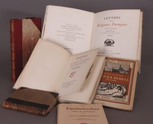 Bruxelles, Henry Kistemaeckers, Editeur, (sur l'édition de Cazin, 1781), (1882). In-8 (23,5 x 14), demi-maroquin et coins rouge, dos à 5 nerfs, compartiments ornés, tête dorée, le premier plat de la couverture conservé, 155 p. Couverture et illustrations d'Amedée Lynen. Bel exemplaire. Joint : [REBELL]. BOISSON (Marius). Hugues Rebell intime. Paris, Marcel Seheur, 1930. In-8, broché. Portrait photographique de Rebell en frontispice, couverture illustrée par Jean Lebédeff. Exemplaire numéroté sur Hollande de l'édition originale. Bel exemplaire. Joint : RIGOLBOCHE (Amélie Marguerite Badel, dite). Mémoires de Rigolboche, ornés d'un portrait. Paris, chez tous les libraires, 1860. In-12, demi-veau et coins brun de l'époque, dos à 4 nerfs (reliure lég. usée), les plats de la couverture conservés. Portrait photographique par Petit et Trinquart. Célèbre danseuse parisienne de cancan (1842-1920), surnommée «la huguenote». Joint : [CARLEGLE]. Lettres de la religieuse portugaise, précédées d'un avertissement dpar Henri Focillon et ornées de gravures sur bois originales de Carlègle. Paris, Léon Pichon, 1917. In-8, en cartonnage de toile avec réimpression de la page de titre au premier plat (travail soigné), non rogné. Illustré de bois de Carlègle. Exemplaire numéroté sur vergé à la cuve des Papeteries d'Arches. Exemplaire frais. Joint : [TOUCHAGUES]. LABE (Louis). Poésies de la Belle Cordière, avec quinze eaux-fortes originales de Touchagues. Paris, Emile Chamontin, 1946. In-8, broché. Illustré. Exemplaire numéroté sur vélin à la forme d'Arches. Bel exemplaire. Joint : SIDREDOULX (Epiphane; Jean-Baptiste-Prosper Blanchemain, dit). Les Fanfreluches. Contes et gauloiseries. Bruxelles, Gay et Doucé, 1879. In-8, en cartonnage de toile moderne, les plats de la couverture (lég. défr.) conservés, non rogné. Illustré de vignettes gravées et d'un frontispice (détaché, gravé par J. Chaiver).