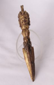 Poignard rituel bouddhiste à trois lames triangulaires en métal doré. Hauteur : 20 cm. Il s'agit d'un poignard sacrificiel. En belle condition.