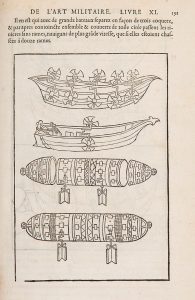 de maroquin fauve. 6 ff. dont le titre, 234 ff. chiffrés, 96 bois gravés à mi-page ou à pleine ; page de titre renforcée d’un fin japon au verso, de même pour la partie inférieure du dernier feuillet. Première édition française du traité de Valturio sur l’art de la guerre, L’illustration reprend celle de la première édition latine donnée à Paris par Wechel en 1532, eux-mêmes inspirés de ceux de Matteo Pasti, élève de Pisanello et l’un des meilleurs graveurs en creux de la Renaissance. Ex-libris héraldique gravé : « Comte de Montmarin.