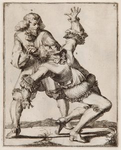 dorés, titre doré sur pièce de maroquin rouge. 7 ff. dont le titre imprimé en rouge et noir, la préface et la table des figures et 71 planches gravées à l’eau-forte par Romain de Hooghe. L’un des tous premiers livre consacré à la défense personnelle "contre les coups de pied et de poing, & même contre les coups de couteau". L’auteur, N. Petter était le « maître » de l’école de lutte Prinsegracht d’Amsterdam. Son élève et successeur, Robbert Cors décida de transmettre son enseignement par l’image (première édition à la date de 1672 en Flamand) en faisant appel au déjà très célèbre Romain de Hooghe (1645 -1708). L’un des chefs-d’œuvre de l’artiste ici dans un excellent tirage, très contrasté.