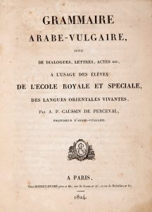 Caussin De Perceval, Armand Pierre. Grammaire arabe-vulgaire à l'usage des élèves de l'Ecole Royale et Spéciale des Langues Orientales Vivantes. Paris, Chez Dondey-Dupré père et fils, 1824, 1 vol. in-4, broché, couverture moderne papier fort...