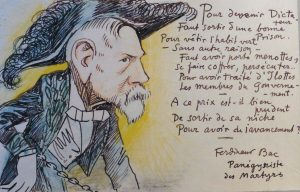 « ... Pour vétir l'habit vert Sans autre raison Faut avoir porté menottes Se faire coffrer, persécuter Pour avoir traité d'Ilottes, Les membres du Gouvernement ... Ferdinand Bac Panégyriste des Martyrs » Dessin à l'encre noir et aux crayons de couleurs, signé, légendé et contrecollé sur carton. 135 x 210 mm