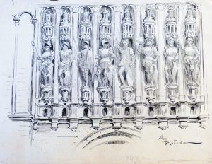 Ecrivain et artiste, illustrateur, car icaturiste et peintre : Les Huit chevali ers ^. Dessin pré p aratoire à la plume et à l'encre noire, signé en bas à droite. Hauteur : 142 mm - Largeur 180 mm. Robida est un des esprits les plus fins de son époque. Autodidacte, il est un dessinateur de talent, en même temps qu'un auteur d'anticipation. Des voyages qu'il fit en Europe, il a rapporté de nombreux dessins, qu'il utilisa souvent ensuite pour illustrer ses ouvrages. Ce dessin est un témoignage du séjour qu'il fit en Suisse et dont il publia le récit en 1878.