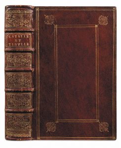 Les Poésies de Catulle de Vérone. En latin et en français. De la traduction de M.D.M. les Eloges de Tibulle. Paris, Guil. de Luyne, 1653 ; deux livres en 1 volume in - 8°, mar. rouge à compartiments, dos à nerfs richement orné, plats ornés à la Du Seuil, dentelle intérieure, tranches dorées. Reliure de l'époque. Texte latin, traduction en regard par Michel de Marolles. Bel exemplaire, avec l'ex-libris sur fond de cuir vert, de Juan GOMEZ de la CORTINA, Marquis de MORANTE, l'un des plus fameux bibliophiles du XIXème siècle. Né au Mexique en 1 808, cet érudit vécut prsque toute sa vie en Espagne ou il fut Recteur de l'Université de Madrid. A sa mort accidentelle et tragique en 1868, il laissait un bibliothèque d'érudition littéraire de 120000 exemplaires.
