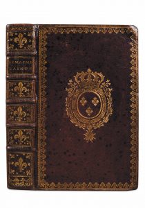 Paris, Colombat, 1727; in - 8° plein maroquin rouge, dos à nerfs à décor d'une fleur de lys répétée, dans des encadrements, plats ornés aux grandes armes du Roi Louis XV. Dentelle extérieure, tranches dorées. Beau frontispice (il représente le Roi et la Reine, en costumes de sacre, agenouillés devant la Majesté divine), beau titre et trois figures gravés. Bel exemplaire bien relié (un coin supérieur légèrement frotté)