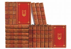 36 tome en 18 vol. in-16, plein maroquin rouge à grain long, dos à nerfs orné, plats à décor doré de filets gras et maigres, fleurons d'angle et d'un large fer central à la lyre et d'une dentelle estampée de palmettes, fine dentelle intérieure, garde de papier brun, tranches dorées. Reliure anglaise strictement l'époque. Chaqu'un des 36 titre et orné d'une belle et grande vignette gravé d'après les dessins d'artiste romantique comme Richard Westall, John Thurston, Henry Corbould, Ex libris manuscrit sur une grande partie des titres, de Henrietta Frances Rawdon, daté de 1821 ; de la Bibliothèque A. de Morel avec son ex-libris. Elégante édition Rousseurs, dos passés. Elegant Extracts. from the Most Eminent British Poets (6 vols). Elegant Extracts. from the Most Eminent Prose Writers (6 vols). Elegant Epistles from the Most Eminent Epistolary Writers (6 vols). Instructive, Moral, and Entertaining. 36 volumes bound in 18. Each volume has an engraved title page. 12mo, full red morocco over gold boards. The moulded top centred by a brass inlaid lyre, brown edges and endpapers. London: John Sharpe, (no date, circa 1820). Some very light scattered foxing, mostly on the engraved pages. Otherwise, exeptional bound set.