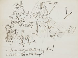 Amédée de Noé, dit Cham (1819-1879) caricaturiste. L.A.S. à Jules noriAc, et 4 dessins originaux à la plume avec légendes autographes ; 1 page in-8 et 4 pages 12 x 16 cm. 21 janvier. Il demande à noriAc un fauteuil d'orchestre : « le besoin...