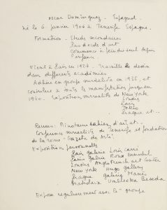 d'agréer mes remerciements sincères ». Il joint une notice biogrAphiqueautographe : « Oscar Dominguez. Espagnol. Né le 6 janvier 1906 à Tenerife Espagne. Formation : Études secondaires ; pas d'écoles d'art ; commence à peindre seul depuis l'enfance. Vient à Paris en 1927. Travaille le dessin dans différentes académies. Adhère au groupe surréaliste en 1935, et contribue à toutes les manifestations jusqu'en 1940 »... Il cite les expositions surréalistes auxquelles il a participé, ses expositions personnelles, les revues auxquelles il a collaboré, les auteurs qu'il a illustrés, les musées qui possèdent ses œuvres, ses décors pour Les Mouches de Jean-Paul Sartre et La Place de l'Étoile de Robert Desnos, les Salons où il expose. Reproduction page précédente