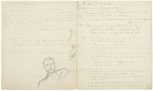 de lA grAvure et de lA peinture, fAites pAr le jeune Artiste à dresde. Cahier étiqueté D^^D^ , avec imitation du monogramme de crAnAch : références bibliographiques ; L. Cranach et son entourage ; l'école italienne des XVe et XVIe (Mantegna, Fabolino, les Farinati, etc.) ; d'intéressants jugements critiques (« pas méchant », « dessin un peu trop défectueux », « anguleux, cubique et froid », « puissante large eau-forte d'un travail assez peu poussé », etc.). Cahier étiqueté G^^D Ga^^ : quelques pages consacrées à Rembrandt et Rubens ; feuillet volant avec portrait caricatural « Der Keifer »... Cahier étiqueté Dürer et l'école allemande du seizième siècle, avec croquis d'une femme corpulente (« Vive la Russie ! ») : relevé de sujets de gravures de Dürer (référence à 12 volumes) ; l'école allemande du XVIe siècle, d'aprèsWoermann et Woltmann... Cahier étiqueté Les Allemands du XVII^ ^ ^.^ a^^ ^ ^ ^ ^ ^. la famille Wierix, H. Hollar ; notes d'après un Recueil d'estampes, Le Peintre graveur de Bartsch, Das Werk Adolph Menzels de Dohme, etc. ; appréciation de qqs contemporains allemands... Cahier avec 3 croquis ou dessins (dont un AutoportrAit) : gravures et dessins de rembrAndt, Dürer (lecture de Lippmann) ; bibliographie critique de Goya ; notes sur H. Thomas, M. Libermann, A. Legros, J. Whistler, divers maîtres anciens... Notes au crayon sur J.-B. tiepolo et son fils Dominique, R. Morghen, J.J. de Boissieu, Véronèse, F. Hals... on joint le manuscrit autographe de sa traduction inachevée des Premiers Secours, « drame rétrospectif » de jodoK, [1903] (cahier 16 ff.).