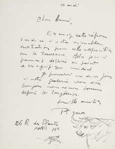Hélas je n'ai jamais dessiné ou peint ce magnifique animal. Je passerai un de ces jours à votre galerie vous dire bonjour »... Sous sa signature, il a dessiné à la plume un taureau et un petit torero.