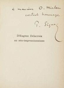 originAle de ce mAnifeste Artistique, dédié à la mémoire de Georges Seurat, et qui avait paru en livraisons dans la Revue Blanche de mai à juillet 1 898. envoi autographe signé sur le faux-titre au grand écrivain et critique d'art Octave mirbeAu : « à monsieur O. Mirbeau cordial hommage P. Signac ». Sur les rapports plutôt tendus de Signac avec Mirbeau, qui n'appréciait guère sa peinture, voir l'étude de Christian Limousin et Pierre Michel, « Octave Mirbeau et Paul Signac », Cahiers Octave Mirbeau, n° 16, 2009 (p. 202-210).