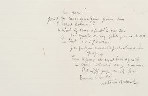 Antonin Artaud (1896-1948). L.A.S. et tapuscrit, [vers 1922, à Paul dermée] ; 1 page obl. in-8 (trace d’épingle) et 4 pages in-4 dactylographiées. « Peut-on caser quelques poèmes dans L'Esprit nouveau ? Consentiriez-vous à publier une série...