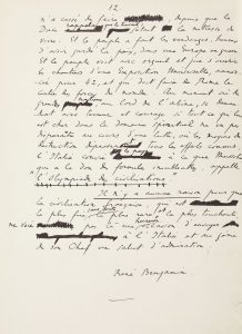 rédigé à l'encre noire, présente de nombreuses ratures et corrections ; il a servi pour l'impression de l'article dans Candide, sous forme de lettre ouverte à Anatole de monzie, ministre des Travaux Publics. Benjamin revient sur les principes nobles qui ont, selon lui, guidé mussolini, un « homme extraordinaire [.] L'idéal, l'esprit, voilà donc ce que soutintd'abord Mussolini, pour le peuple, par le peuple, selon la formule qu'il vient de reprendre. Il fut, après la guerre, le premier grand révolutionnaire, le premier et le plus audacieux. Il comprit sur l'heure ce que d'autres mirent quinze ans à consentir, que la société d'avant-guerre n'était plus viable. [...] La guerre avait confronté les classes. Devait-il en résulter un esprit de lutte ? Au contraire, la fraternité s'imposait entre toutes les valeurs, opposées à toutes les déficiences. [...] Il n'y avait aucune raison pour que la France prît ombrage de cette politique de courage »... Il poursuit à propos des sanctions prises à Genève contre l'Italie en 1935 : « L'Italie entière se serra autour de son chef meurtri, mais dont la volonté restait intacte en face de cinquante-deux nations menaçantes. [...] Il n'y avait aucune raison pour que la France, dans ses traditions de liberté et de fierté généreuse, ne frémît pas devant cette situation tragique. Mais elle avait signé à Genève des contrats de platitude »... Il termine en évoquant l'Exposition universelle de 1942, « l'Olympiade des civilisations », que Rome, malgré une Europe en guerre, envisage d'accueillir ; l'occasion selon lui pour la France « d'envoyer à l'Italie et au génie de son Chef un salut d'admiration ».