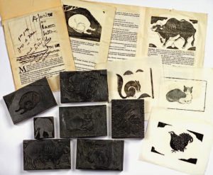 ÉDITION ORIGINALE, tirée à 142 exemplaires. UN DES 7 EXEMPLAIRES SUR VIEUX JAPON avec une suite des bois tirés d’après le procédé japonais sur Massa Dosa du Japon. ON JOINT LA MAQUETTE ORIGINALE DE L’OUVRAGE, ACCOMPAGNÉE DES 7 BLOCS DE BOIS ORIGINAUX GRAVÉS PAR FOUJITA. Maquette : certains feuillets désolidarisés de l’ensemble.