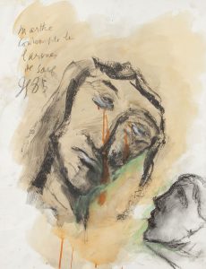 Jean Guitton. dessin original au crayon gras et gouache, signé et daté en haut à gauche « Jg 85 », avec légende autographe, Marthe contemple les larmes de sang ; 65 x 50 cm.