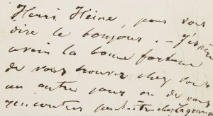 Henri Heine (1797-1856). billet autographe, signé en tête ; carte oblong in-16. « Henri Heine, pour vous dire le bonjour. - J'espère avoir la bonne fortune de vous trouver chez vous un autre jour ou de vous rencontrer peut-être chez Lagrange. »