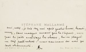 Stéphane Mallarmé (1842-1898). L.A.S. « Sm », à un poète ; 5 lignes sur sa carte de visite à ses nom et adresse 89, Rue de Rome (trace de pli). Il sera chez lui mardi après 4 heures : « venez, sans masque encore que la stupeur, avec quoi le...
