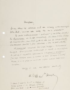 Montherlant remercie Lacôte de s'intéresser à son œuvre poétique, « qui n'a guère les faveurs de mes confrères en “poësie”. C'est avec plaisir que j'apprends que vous ferez lire le Minos, que je crois le meilleur poëme de ce recueil, et qui a toujours épouvanté les récitants tant de la radio que de la Comédie fse ». L'éditeur de Pasiphaé est Armand guibert à Tunis. Il félicite Lacôte de son poème, « gonflé d'un mouvement cosmique auquel je suis très sensible »... [27.XI]. C'est avec plaisir qu'il lira son étude : « La partie techniquement “poëtique” (vers libres, versets) des Olympiques est en effet importante, et vaut d'être étudiée », d'autant que c'est la plus décriée par leurs compatriotes. Son projet d'Almouradiel « comprend 200 pages dactylo. Commencé en 1928. C'est de la prose entrecoupée de versets, et dans l'esprit des poëmes d'inspiration africaine de L'Instant de bonheur. J'ai mes raisons pour ne publier ce livre qu'après d'autres œuvres, et je ne pense pas qu'il voie le jour avant huit ans environ »... 13 mars 1939. Il trouve à son retour à Paris ses deux lettres et son article sur L'Équinoxe de septembre : « Merci de votre attachement à ce que j'écris ». Pour l'étude sur ces poèmes, il songe à une revue, mais préférerait une plaquette. Il déconseille guibert, « qui a déjà publié un petit volume sur moi, et ne peut recommencer. Mais vous pourriez tâter E. chArlot [...] à Alger, qui publie la collection Méditerranéennes et vient de me faire demander de faire partie du Comité de rédaction de sa revue ». Mais s'il décidait de l'éditer lui-même, Montherlant tâchera de trouver un mécène pour le financement. « Combien vous avez raison dans votre article sur l'Équinoxe de parler des erreurs ou des conformismes du public ! La critique (comme la politique) est devenue chez nous primaire ; et ceux de mes confrères qui vaudraient la peine d'être étudiés sont traités presque aussi légèrement que moi »... 21 avril. En parcourant quelques opuscules de poësie de ses contemporains, il constate « qu'eux et moi nous parlons deux langues incommunicables l'une à l'autre ». Il remercie encore Lacôte de son étude, l'une des plus intelligentes consacrée à sa poésie ; il conseille d'étoffer pour une réédition le passage sur Pasiphaë... [1940 ?] « Pour dire vrai, et contrairement à ce que professent mes amis, il me semble que rarement la France ressentit moins de besoin de poësie qu'aujourd'hui. Blindée contre, et plus solidement que sa ligne Maginot »... Bourgogne 1941 . Il veut venir lui dire de vive voix le plaisir que lui a donné son étude : « Ma vieille habitude du désert me fait en effet caravaner qqfois dans les étendues désertiques du bled Barbet de Jouy Vaneau »... [Décembre 1943] Il le remercie de toujours penser à son étude, mais « Almouradiel est avec toutes mes préparations de romans, dans une banque en Angleterre, et je ne sais si je les reverrai jamais ; à vrai dire, je ne m'en soucie guère » ; il lui enverra des places pour Fils de personne. [28 avril 1944]. « Au milieu des tristesses et des horreurs dont nous sommes entourés, votre mot m'est, autant qu'une surprise (et très forte) une joie »... 4 juillet 1944. Il le remercie pour son article sur Service inutile : « Je ne suis pas sûr de “l'importance” de la Lettre d'un père [à son fils] dans mon œuvre ; elle me paraît trop écrite, trop engoncée, manquant de souplesse. Et je crois que j'aime mieux Georges Carrion, avec son inaptitude absolue à l'éducation, que ce pompeux paternel du XVIIe siècle. [...] Vous avez bien vu aussi que je me mets tjrs un peu dans les personnages qui s'opposent à celui qui est censé me représenter [...] de même que, dans la vie, je suis toujours autant et plus du côté de mes adversaires, que du mien propre ». Il sent qu'il est sorti de « l'âge inspiré [...] dont Encore un instant n'est qu'un faible témoignage, le principal étant Almuradiel, actuellement dans une banque en Angleterre, où j'espère pourvoir aller le reprendre sous peu, si les V1 l'ont épargné »... 28 juillet 1 946. « J'ai lu, aussitôt reçu, votre Journal d'une solitude », livre si dense qu'il mériterait autant de pages de commentaires qu'il en compte lui-même. « Il peut y avoir une poësie dans la prose, & tout n'est pas dans la précision. Vous savez tout le chant de la prose française, où il y en a beaucoup plus que dans ce qu'on est convenu d'appeler notre poësie »... on joint une invitation à une conférence de Montherlant, La France de 1938 ; un fragment de brouillon autographe ; et un communiqué dactyl. sur une représentation de Pasiphaë en 1936 au Théâtre Pigalle.