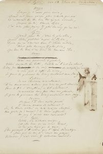 versions d'une ode d'horAce, en traduction et en imitAtion, recueillies dans les Poésies nouvelles de 1850, avec un dessin original. Cette fameuse Ode est un dialogue entre Horace et son ancienne amante Lydie, en 6 strophes. La « Traduction » en vers compte 31 vers (5 strophes de 5 vers, puis une dernière de 6 vers). Le manuscrit présente trois ratures, dont une première version du onzième vers biffée. C'est Horace qui commence : « Lorsque je t'avais pour amie, Quand nul jeune garçon plus robuste que moi N'entourait de ses bras ton épaule arrondie, Auprès de toi, blanche Lydie, J'ai vécu plus joyeux & plus heureux qu'un roi »... Au verso, dessin à la plume et lavis d'encre brune, représentant le haut d'une tour de château, avec une fenêtre à laquelle se montre une femme ; sur le toit, duquel pend un drapeau qui flotte au vent, un homme coiffé d'un chapeau emplumé sonne dans une trompe. L'« Imitation » compte 30 vers (2 strophes de 4 vers, 3 de 5 vers, et la dernière de 7 vers). Le manuscrit présente des ratures et corrections, notamment dans la 4e strophe, qui a été abondamment corrigée ; on relève d'intéressantes variantes de ponctuation avec le texte publié, notamment par l'usage de parenthèses. C'est une version libre, plus concise et allante, que la traduction. « Du tems où tu m'aimais, Lydie, (De tes bras nul autre que moi N'entourait ta gorge arrondie) J'ai vécu plus heureux qu'un roi ». Exposition Peintures et dessins d'écrivains (La Galerie, 1991), n° 152.