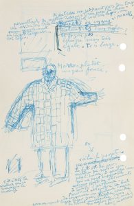 maternel », sa « sollicitude attentive, craintive, réfléchie et délibératrice »... 5 mai. Projet de manteau, avec dessin et croquis : un manteau « ne serrant pas du tout, permettant de mettre dessous très peu de chose », épais, large, « marron, plutôt un peu foncé », convenant à une personne « qui ne peut supporter Aucun poids de vêtement à cause d'asthme »... Vendredi. Il s'inquiète et doit « renoncer sans doute à ce que nous avions envisagé de trop féerique, et s'adresser purement et simplement où vous m'aviez dit, rue Vavin, et leur demander de faire le manteau exactement comme le mien »... 12 mai. Grâce à sa bienveillance, « je deviendrai cet hiver un vrai Samouraï ! Car c'est ainsi [...] qu'ils se vêtissaient lors des froids », mais peut-être pas de duvets d'oiseaux, mais de duvets de « Dragons. Lanceurs-de-Flammes plutôt ! »... 25 mai : « lorsqu'une chose séduit, et éveille, un grand intérêt personnel, l'esprit va, va... et je ne surveille plus autant si vous allez penser que je suis un client bien peu sage, bien peu ménager de votre bienveillance »... 27 mai. Rêverie sur une lithographie de mAtisse, « fort belle, aérienne et formelle ». Souvenir de mAllArmé, qui a fondé, dirigé et rédigé « une périodique sur les choses de la mode féminine et tout ce qui s'y rattachait à l'époque (ce devait être vers 1875 ou 1880). Il parle de tout cela d'une façon ravissante. C'était une publication à l'usage des dames, et purement d'informations pratiques, nullement une publication littéraire »... 3 juin, au sujet d'un film tourné chez lui : « Ça se déroule comme une petite féerie, un rapide opéra-comique ! »... 7 juin. « Je ne me souviens plus quel nom vous proposiez pour mon défenseur chinois ? »... 1 1 juin. « Le tissu imperméabilisé, quelle trouvaille. Comme la solidarité légère de tous les éléments est bien déterminée déjà, et vers une issue si heureuse ! » Il est indigne d'une aussi « galante enveloppe »... 7 juillet. Émerveillement devant le manteau qu'il vient de recevoir, et gratitude pour sa « charmante bienveillance à orner ainsi un vieil homme vous, au demeurant, prêtresse particulière de la Déesse. Titre bien plus beau que celui même de coupeur de Leurs Majestés Britannique ! »... 9 juillet. Il a déplacé deux boutons, et testé le tissu par un petit bain ; quant aux emmanchures, « il n'est nullement besoin du petit soufflet de mon rêve car sans être aucunement gêné, j'ai pu mettre dessous chemise de laine et tricot. Le petit soufflet dont je vous ai parlé serait un ornement superflu à moins qu'on ne le déclare idéal ! »... 20 juillet. « Il m'est déjà venu à l'esprit à vous voir de reconnaître que vous vous refusez à modérer vos démarches, les démarches de votre esprit dans le sens illusoire, imaginatif, comptant peu avec l'obligation où nous sommes tous de ne pas trop chercher à dépasser nos pouvoirs, nos forces & les contingences, à moins que nous ne consentions à nous préparer bien des revers »... 2 novembre, recommandant son amie Mme fAuchier-delAvigne, qui viendra au magasin : « C'est une personne très distinguée de qui les relations amicales sont nombreuses »... 12 novembre. « Le froid est là. J'ai un peu l'espoir que je ne vais pas me trouver sans votre défense tant désirée ; et qui [...] était plus facile à rêver à votre bonté, qu'à former en réalité »... Jeudi. « Toujours si heureux de mon vêtement bordeaux qui m'est devenu expressément familier ; à peu près inséparables lui & moi. Bien entendu le Chinois habite mes rêves »...Etc. Plus 2 cartons d'invitation à une exposition.