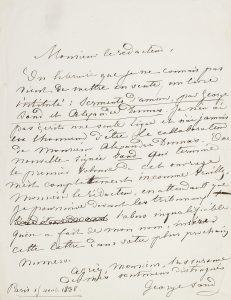 George Sand. L.A.S. « George Sand », Paris 15 août 1838, [à Louis desnoyers, rédacteur du Siècle] ; 1 page in-4. lettre ouverte protestAnt contre une publicAtion. « Un libraire que je ne connais pas vient de mettre en vente un livre intitulé...