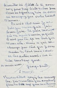 George Sand. L.A.S. « G. Sand », [Nohant] 3 mars 1862, à son ami le peintre Charles marchal ; 4 pages in-8 à son chiffre, enveloppe. belle lettre sur son portrAit pAr chArles mArchAl, et sur lA mort du jeune lucien villot (à l'âge de vingt ans,...