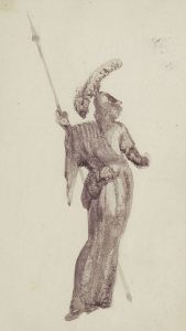 George Sand a admirés en visitant la Logetta du Vatican. Mais le plus important n'est pas là. Pour cette aquarelle, elle est partie de taches informes nées d'un dendritage. Il faut imaginer les deux étapes de la réalisation. Sur la feuille blanche, quatre taches à effets arborescents obtenues par le procédé habituel : le cimier du casque, la main qui tient la lance, le gonflement à la taille du bas de l'égide, quelques plis de la tunique. Cette première étape est commune à toutes les dendrites aménagées. Mais en général George Sand sait - à peu près - au départ, où elle veut aller, si les taches humides deviendront arbres, marais, landes, torrent, rochers, etc. L'habitude aidant, le “hasard catastrophe” est repris, bouleversé. En quelques rapides traits de pinceau, l'abstraction glisse vers l'identifiable. Pour la seconde étape de la Déesse guerrière, aucun détail de tache ne force la main vers un personnage animé (toujours traité en complément dans les dendrites), sauf, peut-être la tache- cimier, immédiatement superposable à une image déjà enregistrée, jaillissant de la mémoire et s'imposant. L'imagination, accrochée par les autres taches, ou parties de taches, reconstitue l'image globale.., sous le cimier, le casque... L'image-souvenir se calque sur le papier. Il suffit de relier les taches... de peindre la lance ». Christian bernAdAc, George Sand, dessins et aquarelles (Belfond, 1992), n° 246. Provenance Aurore Sand (carnet n° 1).