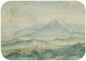 George Sand. dendrite aquarellée originale ; 8 x 11 cm (encadrée). Paysage : chaumières et vaste massif montagneux. Christian bernAdAc, George Sand, dessins et aquarelles (Belfond, 1992), n° 232. Provenance Aurore Sand (carnet n° 1).