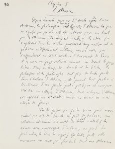 édition fut procurée par les soins de Floyd Gray (CNRS éditions). Le manuscrit, mis au net, présente cependant des ratures, corrections et additions, avec des passages biffés, et des notes bibliographiques en bas de pages. Après une longue introduction (p. 1-72), il comprend les chapitres suivants : I « L'Athénien » (73-117), « Le Polémiste » (118-148), « La Critique » (149-179), « La genèse de la Logique » (180-201), « La Philosophie du Concept » (202-233), « Les deux Ordres » (234-243), « La Plastique de la Pensée » (244-266), « Le Dialogue » (267-294), « La Vie intérieure » (295-334), « Être ou Paraître » (335-356), « La Religion de Socrate » (357-379), « La Pensée politique de Socrate » (381-415), « Les deux Générations » (416-428), « Les Ennemis de Socrate » (429-437), « Le Mort héroïsé » (438-452). Thibaudet entreprend de reconstruire la pensée de Socrate, que l'on ne connaît que par les écrits des autres ; il suit les fluctuations de la critique, notamment des sources antiques (Aristophane, Xénophon, Platon, etc.). Citons la présentation de l'édition en 2008. « Un manuscrit que l'on croyait perdu, l'œuvre magistrale de toute une vie, le portrait d'un Socrate humain, spontané et passionné qui, entouré des bruits de la Cité, inaugure un nouveau genre de vie : le grand texte inédit d'Albert Thibaudet sur le père fondateur de la philosophie occidentale bouscule bien des idées reçues. Thibaudet nous propose un Socrate qui lui ressemble beaucoup, nullement dogmatique, familier et savant. Ce qui le retient, c'est la parole d'un Socrate immédiat et changeant qui se réalise dans un constant échange vivant. Une étude passionnante qui, au-delà de la quête du “Socrate réel”, vaut par les vues d'ensemble portées sur la philosophie - des présocratiques à Bergson -, par les parallèles établis entre Socrate et Euripide, entre les tragiques et les politiques, entre la philosophie et la sculpture grecques, entre l'Ulysse d'Homère et le Socrate de Platon. En ce sens, Thibaudet s'inscrit dans “la marche normale de l'induction socratique qui, écrit-il, est de constater des similitudes, d'aller du semblable au semblable” ». on joint un ensemble de notes et brouillons (environ 200 pages formats divers) ; plus un autre manuscrit autographe sur l'histoire de la philosophie : « Lorsque Thalès en faisant de l'eau la réalité primordiale pose le premier d'une façon philosophique le problème de l'être, l'état d'esprit dans lequel il se plaçait correspond-il à une tendance métaphysique ou à une tendance positiviste ? ». (56 p. petit in-4).