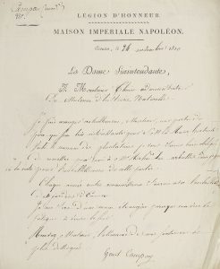 Campan », Écouen 24 novembre 1810, à André thouin, professeur administrateur du Muséum d'histoire naturelle ; 1 page in-4 à en-tête Légion d'honneur. Maison Impériale Napoléon, adresse avec marque postale et cachet de cire rouge à son chiffre. Elle le prie d'envoyer des arbustes pour « arranger une partie du parc qui sera très-intéressante pour S.M. la Reine hortense. Voici le moment des plantations. [...] Chaque année notre reconnoissance s'acroit avec l'embellissement des jardins d'Ecouen ». Elle explique : « Je me sers d'une main étrangère parce que ma vue se fatigue à écrire le soir »... Archives (13 février 1995, n° 8).