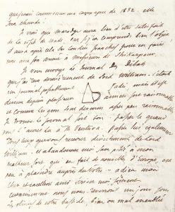 parvenue alors qu'il craignait qu'il ne fût arrivé malheur « à Soubana votre ferrache et au bon homme de cheval isabelle. Si je me suis peint sans fard d'équitation dans ma revue de Sabaton, vous m'avez décrit sans indulgence, dans cette scène dont les Gourkhias de Kennedy garderont longtemps le souvenir. Cet utile serviteur est remplacé. Après avoir cherché et chassé pendant quinze jours quantité d'arabes &c &c dont aucun ne me satisfesait, j'ai acheté à un vieux gentilhomme mogol ami de mon hôte frAser un de ses chevaux ; Turqui de nation, mais Turqui de la plus grande espèce et qui passerait chez nous pour un joli cheval de Hussar ; gris, pommelé, doux comme un mouton, [.] courant fort vite pendant deux lieues, et après cela aussi frais qu'au départ, sûr, adroit de ses 4 pieds. Je lui mets sur le dos une excellente selle anglaise couverte d'une superbe housse de khinkâb, à franges d'or et de soie, une belle bride de velours noir rehaussé d'une quantité d'ornements d'argent doré [.] Je m'apprête, ainsy monté à faire de brillantes entrées dans les capitales semi-indépendantes du Rajpoutana [.] Je suis en train de lever l'ancre. Opération difficile à Dehli. J'y suis du pays, et m'y trouve retenu par l'amitié des uns et des autres. Il faut partir cependant, le soleil l'ordonne, sous peine d'arriver cuit à Bombay. Je voyagerai bien comfortablement, quoiqu'à cheval toujours d'ici jusques là. Les princes Rajepoutes me feront politesse. Ils sont prévenus à l'avance. J'ai un ballot de lettres d'introduction pour les anglais sur ma route. Enfin c'est sous les plus favorables auspices que je vais commencer ma campagne de 1832. Elle sera chaude ! »... Il évoque la visite de Wade à mArAdge, qui aura « après cela ses coudées franches pour en faire une avec son armée à Messieurs de Shikarpour ». Puis il plaisante sur le Journal des Débats, avec le dessin d'un entonnoir renversé. En post-scriptum, il évoque la visite de M. Clerk, d'Ambala, et de Kennedy, à qui il a joué un tour dont l'innocent ne se doute pas. « Il est venu pour prêter serment devant le Résident, en sa qualité nouvelle de juge de paix du roi d'Angleterre à Samlah. Je lui ai écrit à Sabaton qu'il serait nécessaire de produire un certificat de communion. Et en passant par Kurnat [...] il a, en tout bien et tout honneur avalé le goujon des mains du chapelain ou aumônier de cette division »...