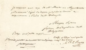 Jean-André Mongez (1751-1788) physicien et naturaliste, aumônier de l’expédition de La Pérouse. P.A.S., Brest 15 juillet 1785 ; 1 page oblong in-8. expédition de lA pérouse. « Je reconnois avoir reçu de Mr mercier un magnetometre qu'il a...
