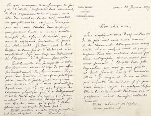 Laboratoire de l'enseignement supérieur, 2 adresses. correspondAnce scientifique et AmicAle à son Ancien élève, l'agronome et chimiste Houzeau (1829-1911), connu pour ses travaux sur l'ozone et l'eau oxygénée. Paris 28 mai [1848], alors qu'Houzeau est son répétiteur à l'école Chaptal, au sujet de son cours. 12 décembre 1853. Il recommande le peintre Paul mArtin, qui a besoin pour une commande de l'Impératrice de voir « l'attirail des laboratoires de chimie, tel que cornues, alambics, serpentins », au laboratoire de boussingAult dont Houzeau est le préparateur... 25 février 1861 . Il évoque son ami deschAmps, avec qui il faisait jadis « beaucoup de botanique rurale », et avec qui il aimerait renouer ; il est père d'une fillette... Collioure 17 février 1870. Longue lettre sur les « travaux ozonométriques » d'Houzeau ; convaincu que « si l'ozone existe elle a sa raison d'être dans une utilité quelconque », Naudin sera heureux de marcher sur ses traces : « les rôles seront intervertis ; c'est vous qui serez le maître »... Il évoque les dégâts causés par la neige à son grand oranger, « le Roi des Orangers de France ». 1^ ^a ^ ^ ^a^ ^ a a^ ^ de recherches, [...] il y aurait quelque chose à en faire pour la biologie végétale »... Il suggère de mettre quelques plantes sous une cloche avec de l'air ozonisé... 24 avril 1875. Commentaire détaillé du mémoire d'Houzeau sur l'ozone, l'incitant à de futurs travaux sur l'ammoniaque et des acides... 13 février 1878. Félicitations sur l'élection d'Houzeau à l'Académie des Sciences ; commentaire du mémoire de F.P. delestre, qui aurait « isolé et mis en bouteille l'éther atmosphérique »... Antibes 22 janvier 1879. Sur son installation à la Villa Thuret à Antibes. Il y a des recherches à faire dans le domaine de la chimie physiologique, suivant celles de M. Corenwinder, de Lille, notamment sur les algues et les plantes aquatiques : « Comment s'exécutent chez elles les fonctions de respiration et d'exhalation ? Qu'assimilent-elles et quelles réactions s'opèrent dans leurs tissus sous les influences de la lumière ou de l'obscurité ? », etc. 27 juin 1879. Réflexions sur le cosmos : « Physique et métaphysique sont de pures conceptions de l'esprit, des catégories subjectives qui n'ont que la réalité que nous leur donnons. La figure sous laquelle le monde nous apparaît est en nous », etc. 21 janvier 1 888. Il prie Houzeau de « juger, expérimentalement, la valeur d'un nouveau fourrage » japonais : « C'est une légumineuse, comme le trèfle »... Nouvelles de sa fille, mariée et mère de famille, et de son fils aîné, victime du surmenage ; quant à lui, il vieillit et se débat contre sa névralgie faciale. L'Empereur du Brésil est venu deux fois le visiter.