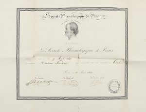 Société Phrénologique de Paris (petites fentes aux plis). diplôme de membre titulaire pour M. fAivre. Le diplôme porte la devise Aux progrès des lumières, et est orné en vignette du portrait de F.J. gAll.