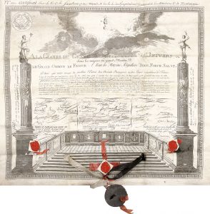 France pendant dans un boîtier métallique sur rubans. beAu brevet mAçonnique délivré au frère Alexandre-Augustin sAmbon, notaire, né à Bellegarde (Loiret) en 1760, membre de la loge de Saint-Jean à l'Orient de Montargis sous le titre distinctif des Hospitaliers d'Heredon et de la Madeleine. Parmi les signataires, on relève diverses personnalités du Grand Orient : Bailleul, Dejoly, Frayssinet, Gaume, Menadier, Ponce, Roëttiers Montaleau, Theurel de Flamicourt, etc. on joint 5 pièces, XVIIIe-XIXe siècle : lettres de ratification, assignats, passeport à l'intérieur, certificat de la Médaille de Sainte-Hélène.