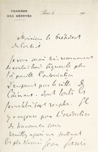 Jean Jaurès (1859-1914) homme politique. 2 L.A.S. ; 1 page in-12 à en-tête La Petite République, et 1 page in-8 à en-tête Chambre des Députés. [Vers 1894 ?] : « Je recommande à M. le ministre du Commerce la demande de notre jeune ami M....